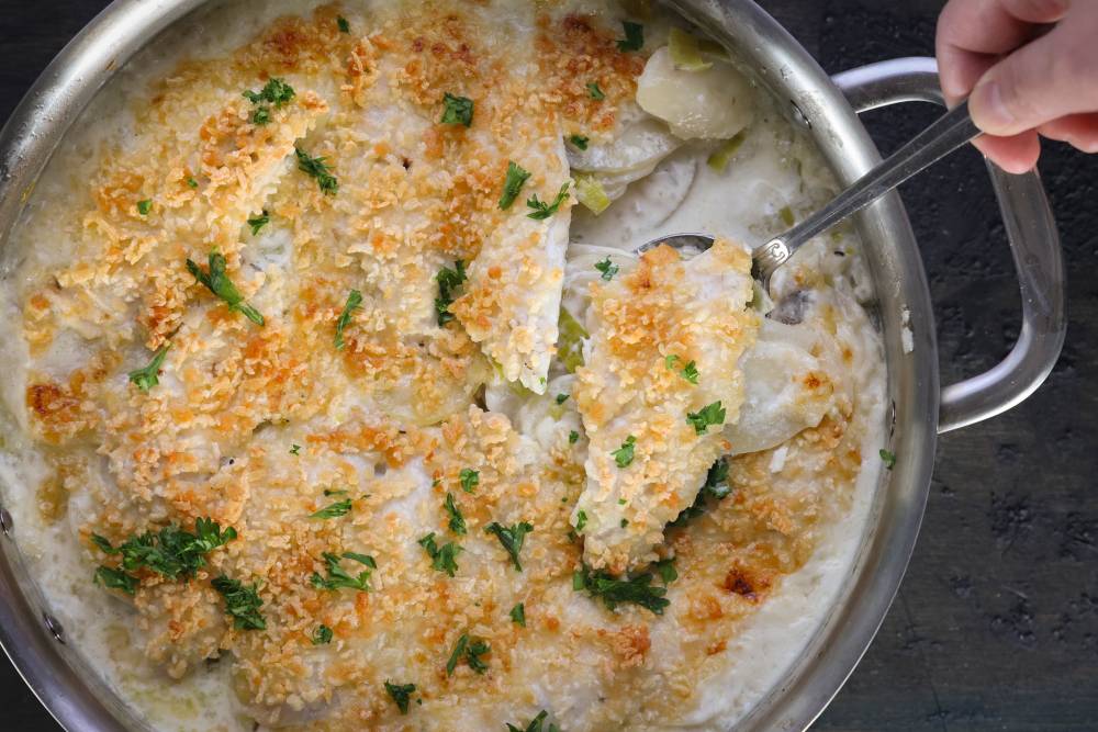 Take pan off heat. Lay perch in one layer on top of the potatoes and leek. Submerge with heavy whipping cream. Evenly distribute the panko-parmesan topping over the casserole. Bake in a 350-degree oven on the middle rack for 30 minutes.