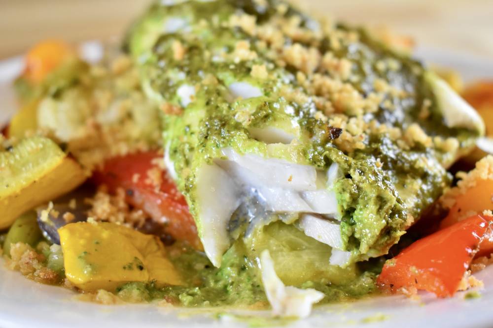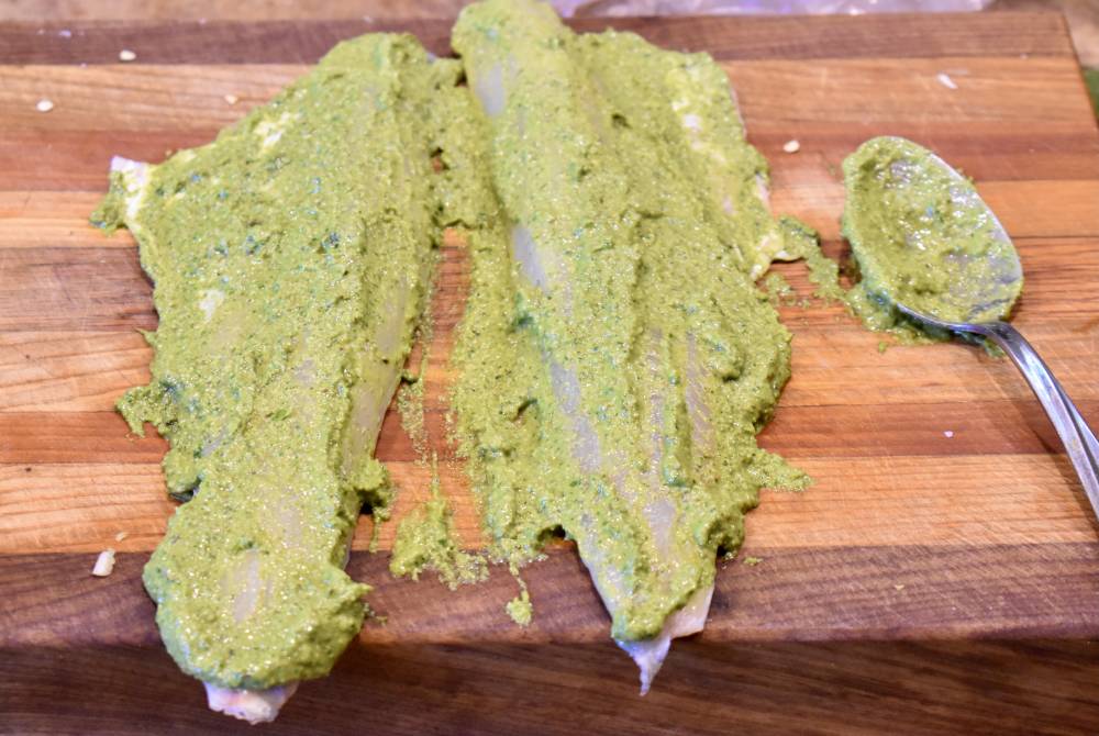 Pat the fish dry with paper towels. Generously smear pesto over the surface of the fillets.